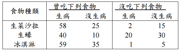 【已刪除】一、某醫院爆發食物中毒事件,100 位工作人員中有 60 位在醫院餐廳用餐後發生食物中 毒。經調查後資料顯示如下:
