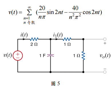 【已刪除】五、如圖 5 所示,若輸入電壓v(t)如下式,試求穩態電壓vo(t)之傅立葉級數前四項。 (20 分)