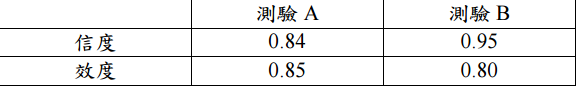 【已刪除】四、假設某大學想藉由一個代數性向測驗來幫助決定那些高中生可以至該校先修高等代 數課程,以下是二個可供選用的測驗(A & B),此二份測驗除了在信度與預測效 度有所差異外(見下表),其他方面(成本、形式、計分)條件相當。請問該校應 該選用那一個測驗,並具體說明選用理由。(10 分)