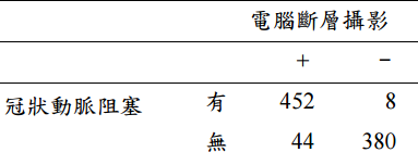 【已刪除】一、冠狀動脈阻塞一般用心導管檢查來判定,最近也用電腦斷層攝影(CT)檢驗,以下 表格是電腦斷層攝影結果,求電腦斷層攝影檢驗冠狀動脈阻塞的敏感度、特異性、 陽性預測值、陰性預測值。(20分)