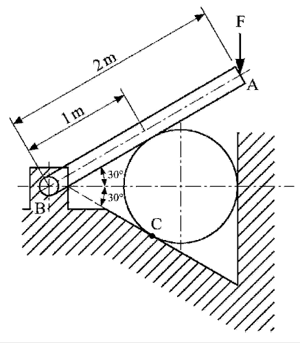 23.如圖(八)所示,AB 斜桿壓制一圓柱體,斜桿與圓柱體之重量可忽略不計,斜桿左端為 銷連結,右端受到一垂直向下外力 F = 1000 N,若各物體接觸面皆為無摩擦之光滑表面, 則圓柱體與地面接觸之 C 點反作用力是多少 N?