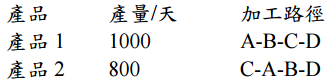 【已刪除】四、某工廠生產二種產品(產品 1 和 2),使用 A, B, C, D 等四種設備。其每天的產量 和加工路徑如下。由於產品 1 的體積較大,搬運一個產品 1 等於搬運三個產品 2。 請繪製該工廠的從至圖,圖中以產品 2 的流程當量表示。(10 分)