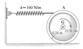 【已刪除】三、如圖所示之滾輪質量為 20 kg,其迴轉半徑(radius of gyration)為 0.18 m,外半徑 為 0.24 m,且於外部纏繞連接一彈簧,其彈簧常數為 160 N/m。若滾輪於初始位置 為靜止且彈簧為自由長度,當開始施加 23 N.m 之固定力矩後,滾輪與地面間在沒 有滑動之情形下,重心 G 往前行進 0.15 m 時,試求此時滾輪之角速度。(20 分)