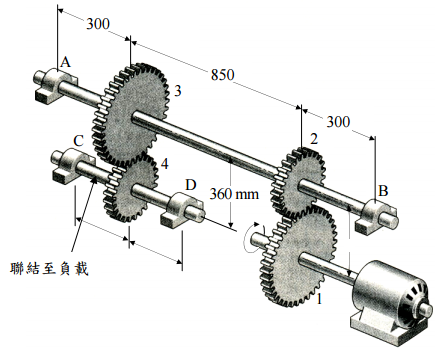 【已刪除】二、下圖所示為一增速齒輪系,當馬達轉速為 900 rpm時,其輸入馬力為 10 kW。中間 軸AB之材料為中碳鋼,降伏強度為S