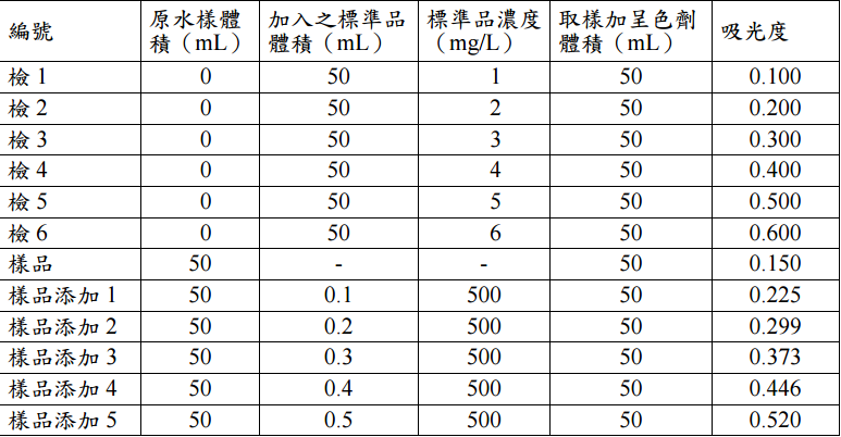 【已刪除】一、今有利用分光光度計比色法檢驗一污染物之原始吸光度資料如下表。因為懷疑有基質干 擾的情形,故進行標準添加法分析。請估計水樣中待測污染物之真實濃度。(10 分)
