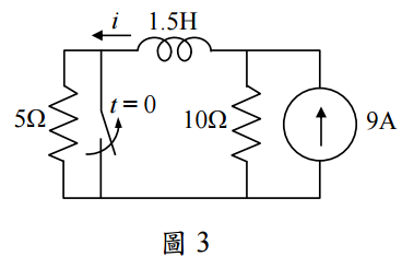 【已刪除】三、圖 3 中之開關在 t = 0 之前為關閉狀態,而且電路已達穩定狀態,在 t = 0 時,開關 打開,求電感電流