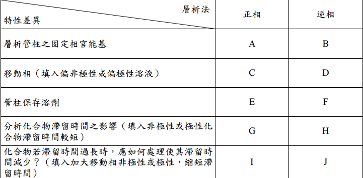 【已刪除】三、請就下表表格中之⑴層析管柱之固定相官能基⑵移動相⑶管柱保存溶劑⑷分析化合 物滯留時間之影響⑸化合物若滯留時間過長時,應如何處理使其滯留時間減少?來 比較說明高效能液相層析儀(HPLC)其正相及逆相層析法之差別。 請將最適合之答案填入 A~J 之空格中。(每格 2 分,共 20 分)