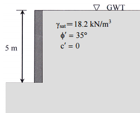 【已刪除】四、如圖所示之擋土牆背填土為砂質土壤,其摩擦角為 35°,地下水位與地表同高,牆 高為 5 m。試計算及繪出背填土之垂直有效應力、孔隙水壓力、側向主動土壓力分 布圖,並求出作用在擋土牆之合力大小與位置(由牆底起算)。(25 分)