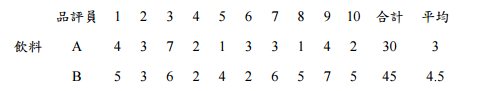【已刪除】四、某 A、B 兩種飲料,經 10 位品評員評分,結果如下表: