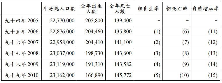 【已刪除】四、下表為 94~99 年某地區各年底人口總數及各年之出生與死亡人口數,分別計算其 粗出生率、粗死亡率及自然增加率(1)~(15)(取到小數點第二位,以下四捨五入)。 (每小題 2 分,共 30 分)