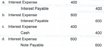 3. A gift shop signs a three-month note payable to help finance increases in inventory for the Christmas shopping season. The note is signed on November 1 in the amount of $40,000 with annual interest of 6%. What is the adjusting entry to be made on December 31 for the interest expense accrued to that date, if no entries have been made previously for the interest?