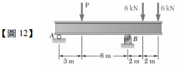 12.三個力作用在如【圖 12】的樑結構,A 處是滾子(roller),B 處是支持銷(pin)。當 P = 15 kN 時,請問 B 處垂直方向的反應力為何?