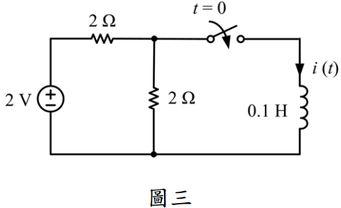 【已刪除】四、如圖四所示之電路,若電路已達直流穩定狀態,當 t = 0 時開關閉合,求 v (t)。(20 分)