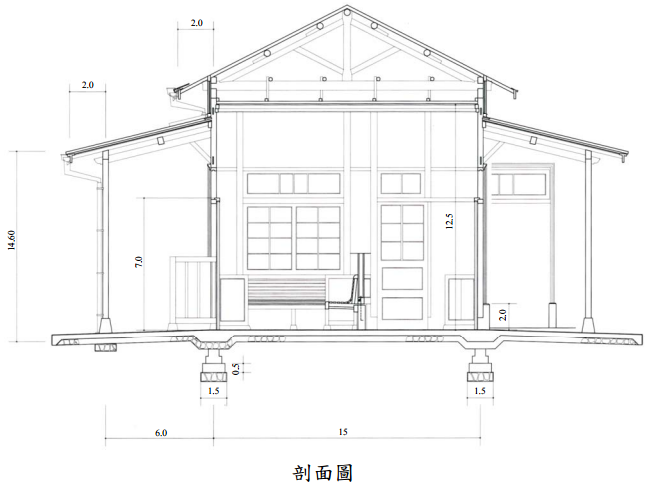 二、建築圖形表現(60 分) 下列圖面為某鐵路車站之平面、立面及剖面圖(以上圖面之比例關係請自行掌握), 請根據這些圖面繪製出剖面透視圖及等角透視圖各一(圖面比例尺自訂,側向立面 請自行假設)。