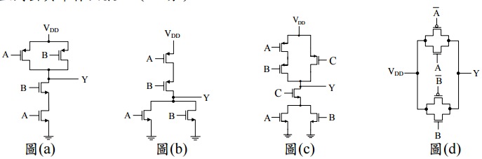 【已刪除】五、如下圖(a)~(d)數位邏輯電路,其中 A, B, C 等為輸入,Y 為輸出,試寫出其真值表 並列出其布林函數。(20 分)