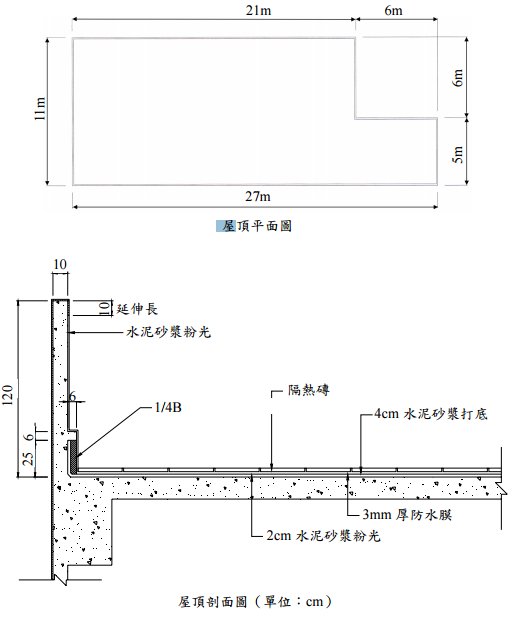 【已刪除】六、計算下圖屋頂防水隔熱層之總數量及單位面積數量(考慮損耗為 3%),計算項目 含砌 1/4B 磚、女兒牆內側 2cm 水泥砂漿粉光、3mm 厚防水膜、4cm 水泥砂漿打底及 面層隔熱磚。(25 分)