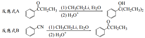 【已刪除】八、酮類化合物與有機鋰試劑(organolithium reagent)反應可轉換為醇類(如反應式 A), 但腈類化合物與有機鋰試劑反應則獲得酮類產物(如反應式 B),不會再繼續反應 為醇類化合物,試以反應機構說明理由。(10 分)