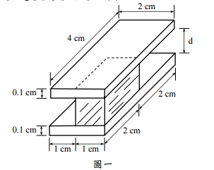 【已刪除】二、如圖一所示,以兩片 4 cm 長、2 cm 寬,厚度 0.1 cm 的平行銅板當電極,間距 d=0.3 cm,其中在銅板中間有 2 cm 長、1 cm 寬的相對介電常數(relative dielectric constant)=5 之雲母介質材料(如斜線所示),其餘空間為空氣,並無其他介質材 料,試求兩電極間之電容值多少?(20 分)