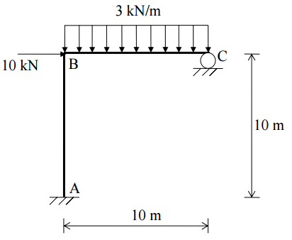 【已刪除】二、如圖所示剛架結構在 D 點處為鉸接。BC 桿件承受 1kN/m 之垂直載重。應用單位力 法求 C 點之轉角與水平位移。各桿件之 E、I 均相同。(25 分)