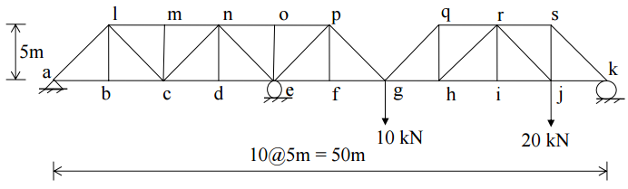 【已刪除】一、如圖所示桁架結構各接點均為鉸接。於 g、j 兩點各承受一集中載重。請分析求各支承 反力,與桿件 no、ne、de 之桿件力。各桿件之 E、A 均相同。(25 分)