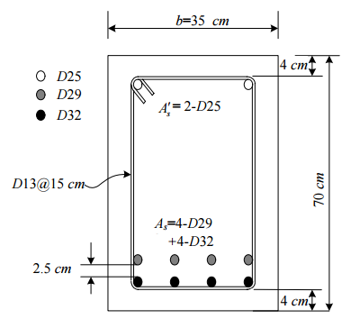 ,拉力鋼筋分兩層,每層四根鋼筋,上層4-D29 下層4- D32,兩層鋼筋之淨間距為 2.5 cm,試求梁之彎矩設計 強度φ M