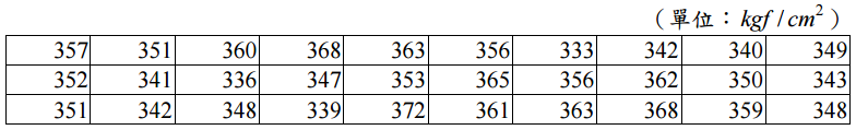 的試體強度資料,資料 如下表(平均值= 352.5 kgf/ cm