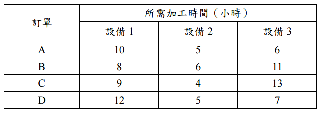 【已刪除】四、假設某工廠收到下列四個訂單,需由三部設備加工完成,且所有訂單均需以:設備 1 到設備 2 到設備 3,順序經過該三部設備,請以強生法則(Johnson’s rule)決定該 四個訂單之排序,並繪出該三部設備排程之甘特圖(時間從 0 開始),以及指出該 排程之製距(makespan)及平均流程時間(mean flow time)。(25 分)