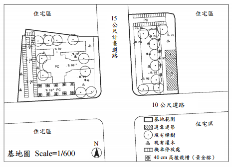 【已刪除】二、作圖題:(70 分) ⑴設計主題:社區公園更新 臺灣地區都市快速發展,都市人口急劇膨脹超過都市公共設施和地區資源負 荷,致使都市居住環境品質日趨惡化。加之諸多老舊公園綠地因缺乏妥善管理而 乏人問津,導致都市綠資源的浪費。都市更新是延續都市生命的必要手段,透過 都市更新將窳陋地區予以拆除、重建、保存維護等措施來增進都市機能,促進都 市整體健全發展。本都市公園將配合地區更新,提供周邊居民一處具環教性、生 態性及可參與性的公共休憩場所。 ⑵基地概況:(詳基地圖) 1.位置:基地位於某市的都市更新地區,二處公園為-15 公尺寬的計畫道路所 分隔。 2.基地現況:目前兩處公園內有冠寬 5 公尺的樟樹,除部分因生長空間受限而生 長不良外,其餘大致情況良好。零星種植的灌木和黃金榕則因乏人管理而生長 情形欠佳。基地內現有違建和機車停車處將配合更新予以拆除。 3.周邊狀況:目前多為 1 至 4 層樓不等的傳統磚造住宅和鐵皮屋,未來將更新為 生態社區,由不同社會階層、年齡結構和職業的居民所組成。 ⑶設計要求: 1.依據生態社區居民特性,研擬公園主題。 2.依據擬定之公園主題,界定基地空間機能和土地使用。 3.空間屬性須具有環教性、生態性和可參與性。 4.除現有樟樹必須保留,必要時可作適度移植之外,其餘現有植物由設計者自行 決定處理方式。 ⑷設計內容: 依據自定的空間機能和土地使用,提出適當的設計內容。 ⑸圖說要求: 1.設計說明:主題說明、土地使用、動線規劃及設計構想。 2.全區配置圖(含植栽計畫、設施及照明計畫,比例 1:200)。 3.全區剖立面圖(含二處公園之縱向各一,跨二處公園之橫向一,比例 1:200)。 4.二處局部設計構想示意圖。