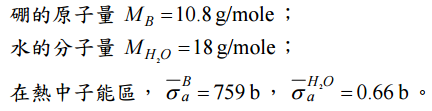 【已刪除】六、假設某一輕水式核反應器的熱中子利用因數(thermal utilization, f )為 0.92,爐 心初始的有效增殖因數為 1.0621,試問該引入濃度為多少 ppm 的硼,方可當移出所 有的控制棒,該核反應器仍維持在臨界狀態(即 k