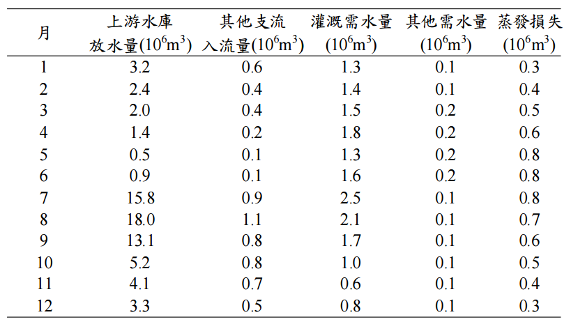 【已刪除】四、水庫預定興建地點之入流量與需水量資料如下表所示,而水庫上游尚存有另一水庫, 試計算為滿足需水量之水庫蓄水容量為何?(25 分)