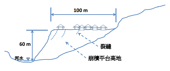 【已刪除】五、某一河道邊有一塊五百年歷史之舊崩塌形成之平台高地如圖,此高地上有約二百戶 民宅住有約六百人,因河水下蝕河道與側蝕該平台高地坡址的關係,近二年來該崩 積平台高地之地面出現平行於河道的裂縫、民宅亦出現龜裂傾斜現象,每逢雨季降 雨後,位移量加劇。因為有保全對象的關係,整治單位需要進行處理,請針對該河 道邊平台高地之狀況,構想治理對策與方法。(20 分)