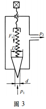 【已刪除】四、圖 3 所示之液壓洩壓閥(relief valve),已知閥孔直徑d = 10 mm,提動頭(poppet) 直徑D = 15 mm,當壓力達到p