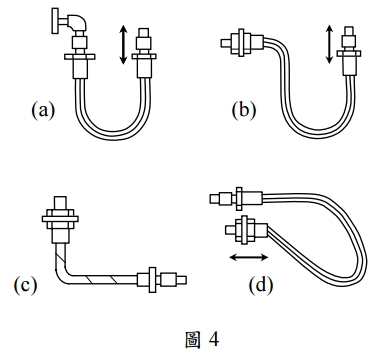 五、圖 4(a)~(d)四種液壓軟管接法中,何者為正確接法?何者為錯誤接法?為什麼?(圖 中箭號表示軟管接頭可能移動的方向)(20 分)