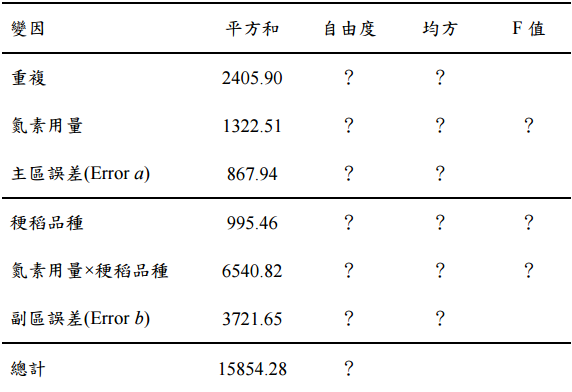 【已刪除】四、某農藝學家從國家種源庫中隨機抽出近 80 年來在臺灣育成的 10 個稉稻品種,探討 它們在每公頃施用氮素 0, 60, 120 及 180 公斤的四種氮肥用量下之稻穀產量的變化。 試驗採用裂區設計(split-plot design):以氮素用量為主區試因(main-plot factor), 稉稻品種為副區試因(sub-plot factor);主區試因之各處理等級的排列採用隨機完全 區集設計(RCBD),重複四次。稻株成熟時,調查每一副區的稻穀產量(kg/plot)。 試驗數據經初步統計分析,結果如下: