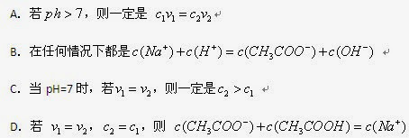 9.室温时,将浓度和体积分别为 、 的NaOH溶液和 、 的 溶液相混合,下列关于该混合溶液的叙述错误的是 (A)若 ,则一定是 (B)在任何情况下都是 (C)当pH=7时,若 ,则一定是 (D)若 , ,则