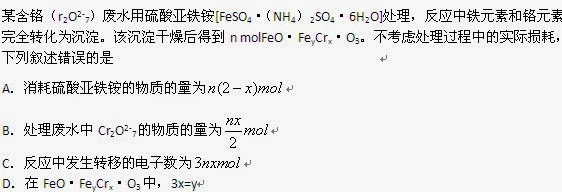 13.某含铬(r2O2-7)废水用硫酸亚铁铵[FeSO4•(NH4)2SO4•6H2O]处理,反应中铁元素和铬元素完全转化为沉淀。该沉淀干燥后得到n molFeO•FeyCrx•O3。不考虑处理过程中的实际损耗,下列叙述错误的是 (A)消耗硫酸亚铁铵的物质的量为 (B)处理废水中Cr2O2-7¬的物质的量为 (C)反应中发生转移的电子数为 (D)在FeO•FeyCrx•O3中,3x=y 二、选择题:本大题共8小题。在每小题给出的四个选项中,有的只有一个选项符合题目要求,有的有多个选项符合题目要求。全部选对的得6分,选对但不全的得3分,有选错的得0分。