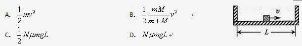 20.质量为M、内壁间距为L的箱子静止于光滑的水平面上,箱子中间有一质量为m的小物块,小物块与箱子底板间的动摩擦因数为μ。初始时小物块停在箱子正中间,如图所示。现给小物块一水平向右的初速度v,小物块与箱壁碰撞N次后恰又回到箱子正中间,井与箱子保持相对静止。设碰撞都是弹性的,则整个过程中,系统损失的动能为 (A) (B) (C) (D)