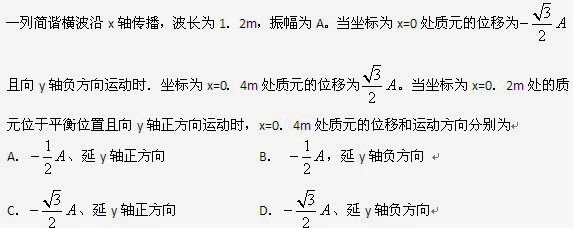 21.一列简谐横波沿x轴传播,波长为1.2m,振幅为A。当坐标为x=0处质元的位移为 且向y轴负方向运动时.坐标为x=0.4m处质元的位移为 。当坐标为x=0.2m处的质元位于平衡位置且向y轴正方向运动时,x=0.4m处质元的位移和运动方向分别为 (A) 、延y轴正方向 (B) ,延y轴负方向 (C) 、延y轴正方向 (D) 、延y轴负方向