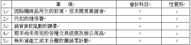 【已刪除】三、請填入適當的會計科目,並寫出其性質別代號,若為該性質別之抵減科目,請加註“-”。(每格2分)