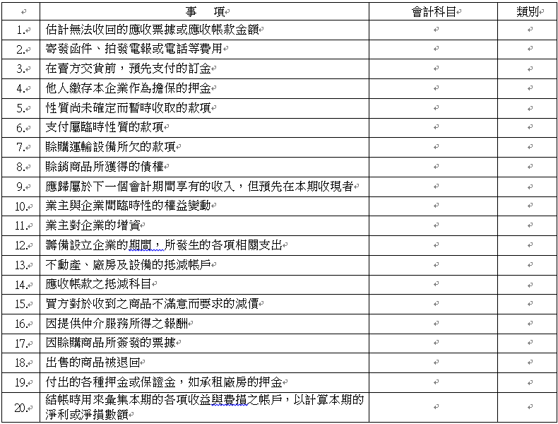 【已刪除】四、請填入適當的會計科目,並寫出其類別(A、L、C、R、E),若為該類別之抵減科目,請加註“-”。(每格1分)
