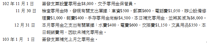 11.下列有幾項交易貸記「零用金」科目?動支零用金、定期撥補零用金、減少零用金定額、期末報銷費用時來不及撥補零用金。 (A)一項 (B)二項 (C)三項 (D)四項