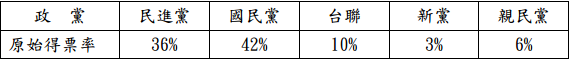 【已刪除】1.假設下表為我國某次立法委員選舉,各政黨原始得票比例,請算出各政黨在全國不分區的分配席次情形為何?