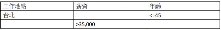 50. 在 Excel 中,有一自訂準則範圍如下,此準則之意義為何? (A)工作地點在台北且薪資在 35,000 以上且年齡不高於 45 歲 (B)工作地點在台北或薪資在 35,000 以上或年齡不高於 45 歲 (3)(工作地點在台北且年齡不高於 45 歲) 或薪資在 35,000 以上 (D)(工作地點在台北或年齡不高於 45 歲) 且薪資在 35,000 以上