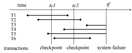 【已刪除】三、假設在一資料庫系統中有 6 筆 transactions 其執行狀態如下圖,其中 tc1 與 tc2 表示 checkpoint 的時間,tf 表示發生 system failure 的時間。為了達成資料庫系統的 recovery,請說明要用何種機制?並請詳細說明此機制在每一 checkpoint 時的訊息 紀錄,以及說明每一筆 transaction 在發生 system failure(tf)後,該進行何種動作? (25 分)