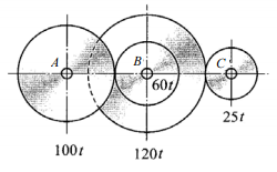 16如圖所示之輪系(t表齒數),若A軸轉速為順時針120 rpm,試求C軸之轉速與方向: