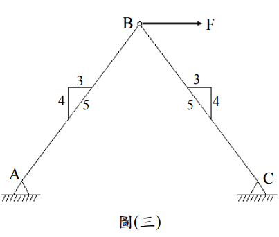 【已刪除】三、圖(三)顯示一均勻斷面金屬桁架(truss),若桿件AB為邊長 4 cm之正方形斷面, 桿件BC為半徑 3 cm之圓形斷面,且兩桿件之長度均為 200 cm,材料性質均為:E =300000 kgf/cm