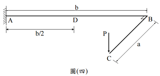 【已刪除】四、圖(四)係一水平面上之構架(即A, B, C三點共平面),假設AB與BC兩圓形斷面桿 件夾直角,試計算D點垂直位移。若a=200 cm,b=400 cm,兩桿件之斷面積為A