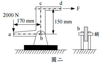【已刪除】三、如圖二所示,ab 長度為 170 mm,bc 長度為 150 mm,在 a 端施加一垂直向下之力 量 2000 N,在 d 端則有一水平力 F 以保持平衡,b 銷裝置如圖二之右邊小圖,b 銷 直徑為 6 mm,試求 b 銷所受之平均剪應力為多少?(20 分)