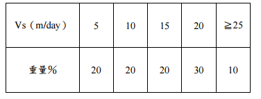 /day,廢水中含有不同粒徑之懸浮固體物,其沈降 速度分布與相對應之粒子重量百分比如下表。試估算此股廢水流經一表面負荷為 25 m