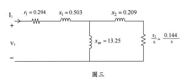 【已刪除】四、如圖三所示電路為一台 3 相 Y 接 6 極,60Hz,220V,10hp 之感應電動機,參照至 定子側之弦波穩態單相等效電路,其中參數之單位均為歐姆,若已知施加額定電壓 時,該機之滑差 S 為 0.02,試求該機此狀況下之轉速為多少 rpm 以及此時輸入側之 線電流大小值。(20 分)